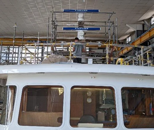 Bridge electronics work is well underway, the radars have been installed on the mast.
