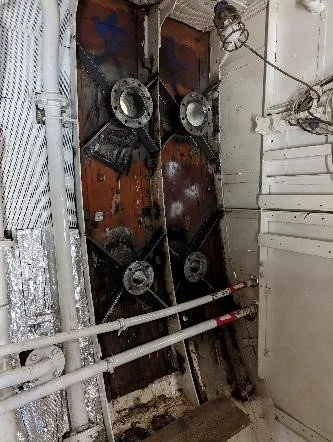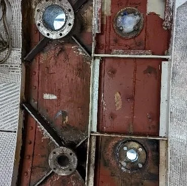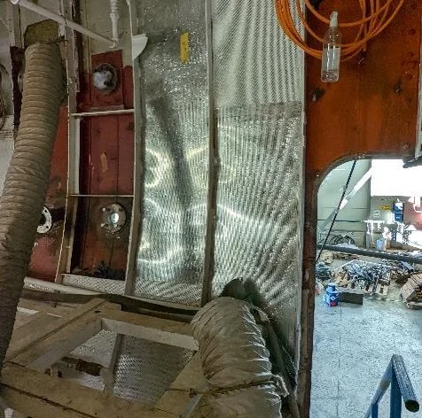 The old main engine exhaust outlets have been welded shut and will also require surveying by RINA