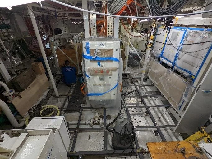 The heat exchanger that will cool all the E motion supply equipment has arrived. The shipyard are already preparing the mounting brackets and drip tray.