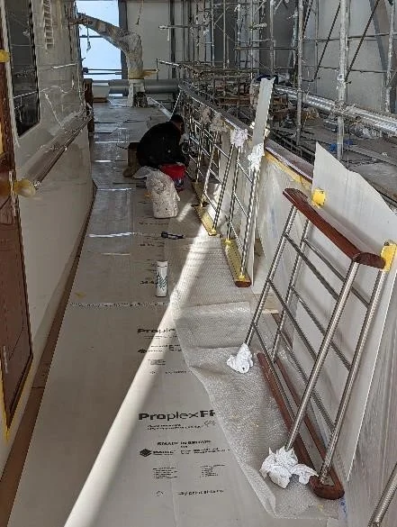The crew have begun the task of re installing the newly varnished handrails, slight modifications will have to be made to suite the different height of the new teak deck to the deck connections.