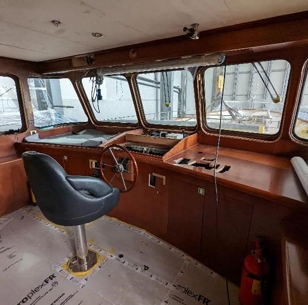 The interior wooden facias and steel framework were removed on the 5 flat and 2 curved bridge windows. It was found that the flat glass must be removed from the exterior. To do so would cause additional works and delays.