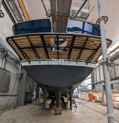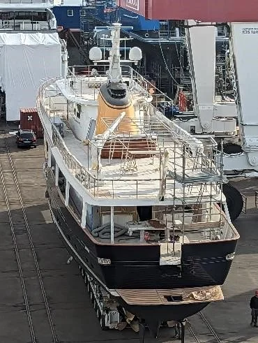 Following a paint rejection during the previous month, the port and starboard hull above the rubbing strake aft along with the transom was re sanded and painted in topcoat. Additional care was taken to reduce dust levels and vibrations on the hull during the paint process.