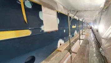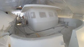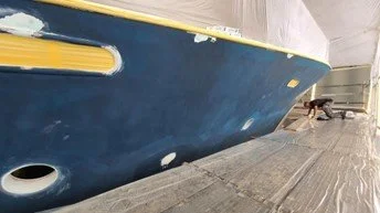 Hull sanding begins with spot repairs being filled. Portholes are now faired for primer paint.
