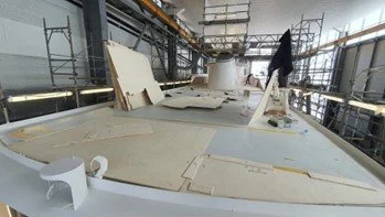 Wood templates are laid out on the deck to check and confirm the new teak deck panel sections.