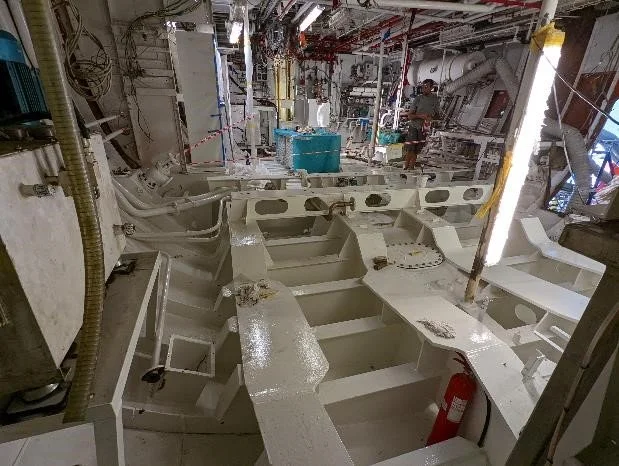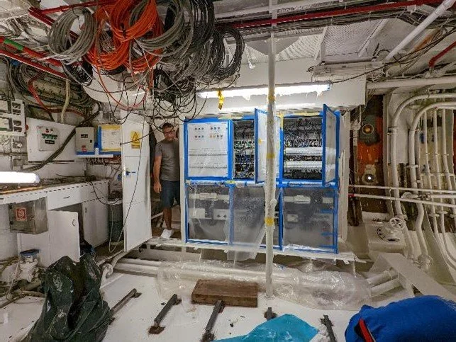 New engine room equipment is continuing to arrive on site, components are being assembled and ready for engine room embarkation accordingly. Electric propulsion motors, gearboxes, and diesel generators.