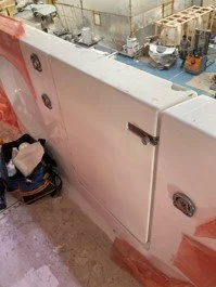 •The door itself is being installed, including all lugs and piston mechanisms.