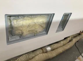 • Windows on the hull and topsides have been installed. They are missing the sika final application,