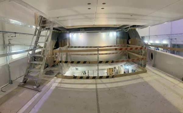 • Please note the opening in the deck, which will be used to insert the main engines into the engine room. Following that, this hatch will be adequately closed in order to continue with outfitting of these areas,