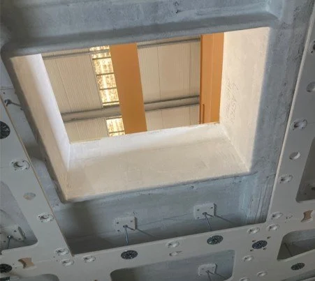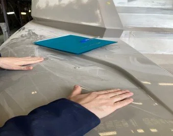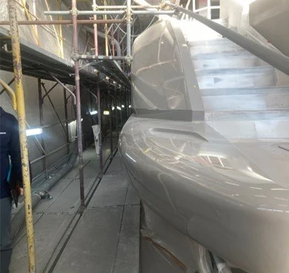• Fairing work on the exterior is ongoing as well as evidence of first coats of topcoat –this is an excellent development and this first coat is not only a filler coat but is used to sand back and iron out imperfections-The chosen Hull colour looks great.