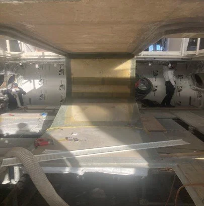 Below: Stainless plates bonded on hull in preparation for installation of Kamewa “ nozzles”