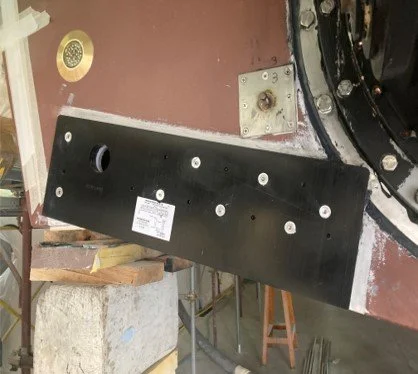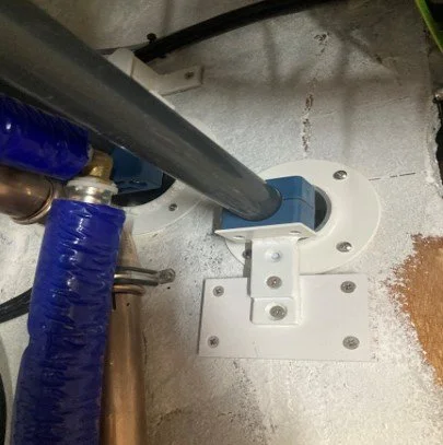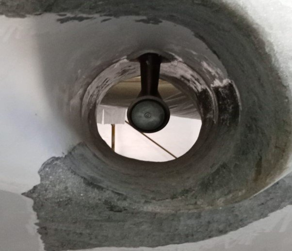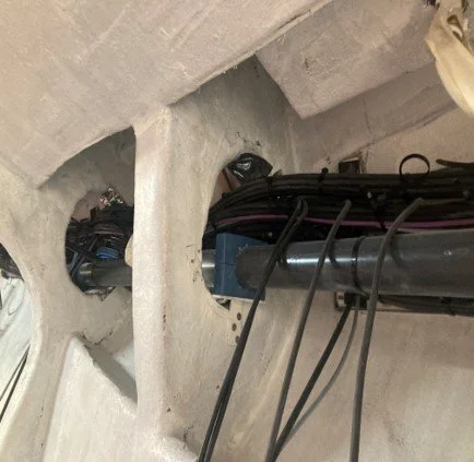 Right: Bow thruster bracket/shaft in position. Note there is further Fibre glass work ongoing.