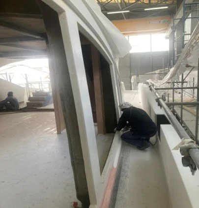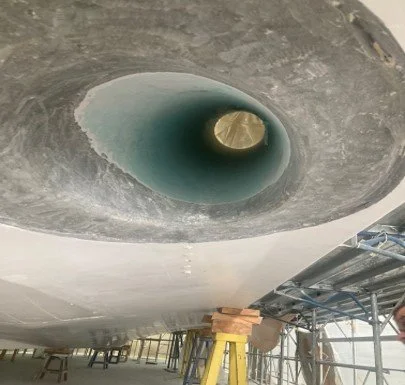 An on-site survey was also conducted and these images relate to the progress at this time. As she is at an early stage in the adventure we are studying the FRP practice and results. There is good evidence of correct overlapping of fibre glass matting throughout as well as reinforcement on deck joints with approved bonding/sealing joints.