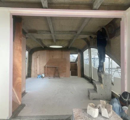 BELOW DECKS IS AT A VERY EARLY STAGE OF BILGE PIPE INSTALLATION / WIRE TRAY INSERTION AND CONT’D FRP WORKS.