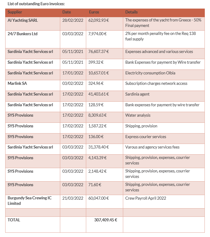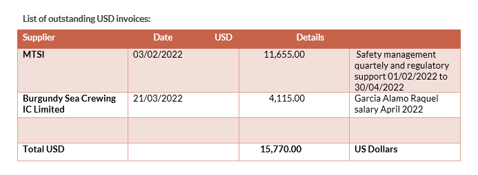 Under previous ownership, the Captain has made funding request directly to the owner’s team as and when he has needed funds. Funds are then provided to the owner’s accounting office in Paris and invoices paid by them. Often funds received have not matched the request made by the Captain, therefore spending has needed to be reduced and regularly there have been bills that have not been able to be paid.