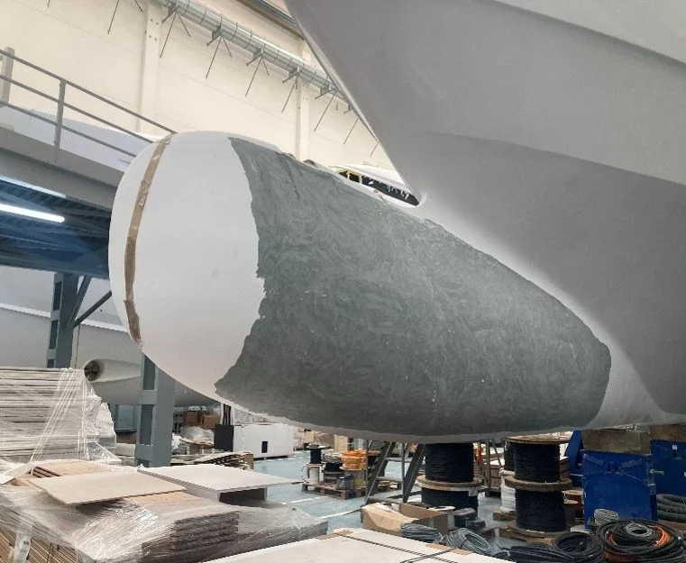 •Fibreglass gelcoat has been sanded away for protection bars below the anchor housing and on the bulbous bow,