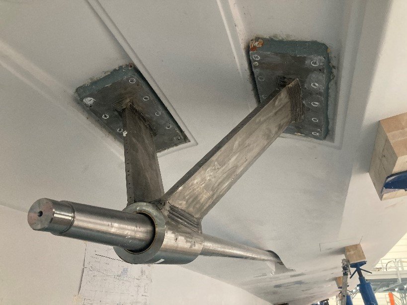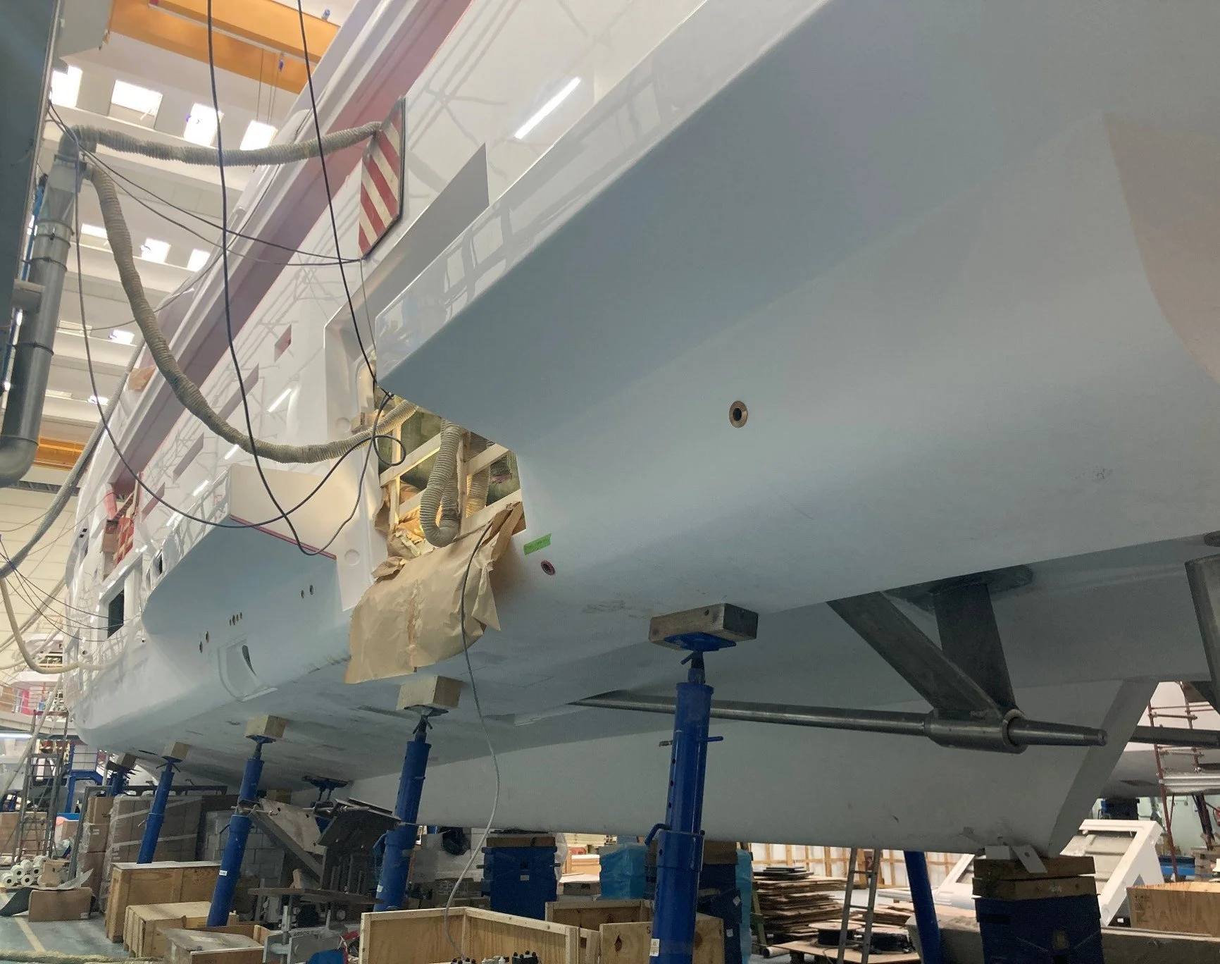 •Shaft line and rudders are in place. Propellers not installed yet. Rudders require full paint cycle,