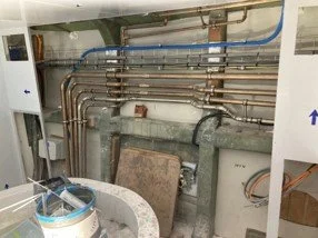 •Engine control room is mostly outfitted with all its switchboards and piping. Following many weeks of cables laying throughout the area, they have now been connected and the area is looking a little more neat and tidy.