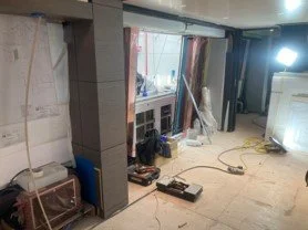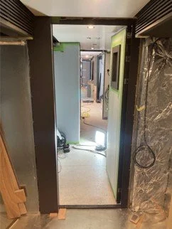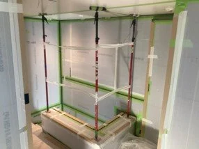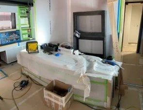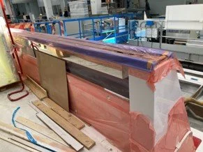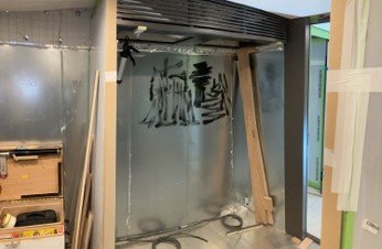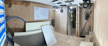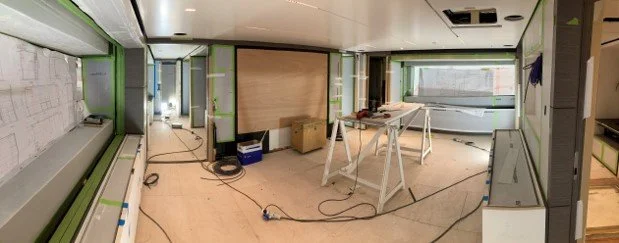 •Joinery walls in the finished woodwork are now in place and covered for protection,