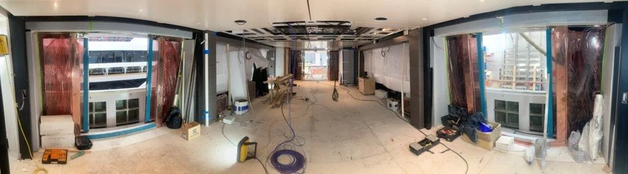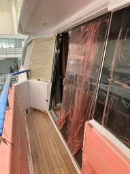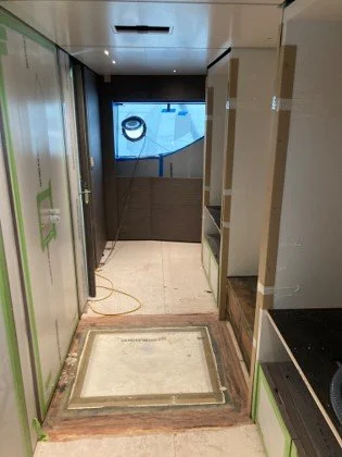 •Most of the windows have been installed except for the stbd aft guest window which is open to allow furniture to be embarked on the vessel,