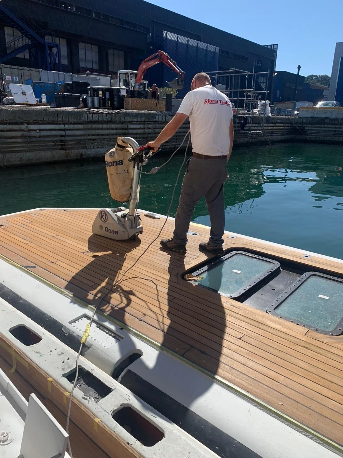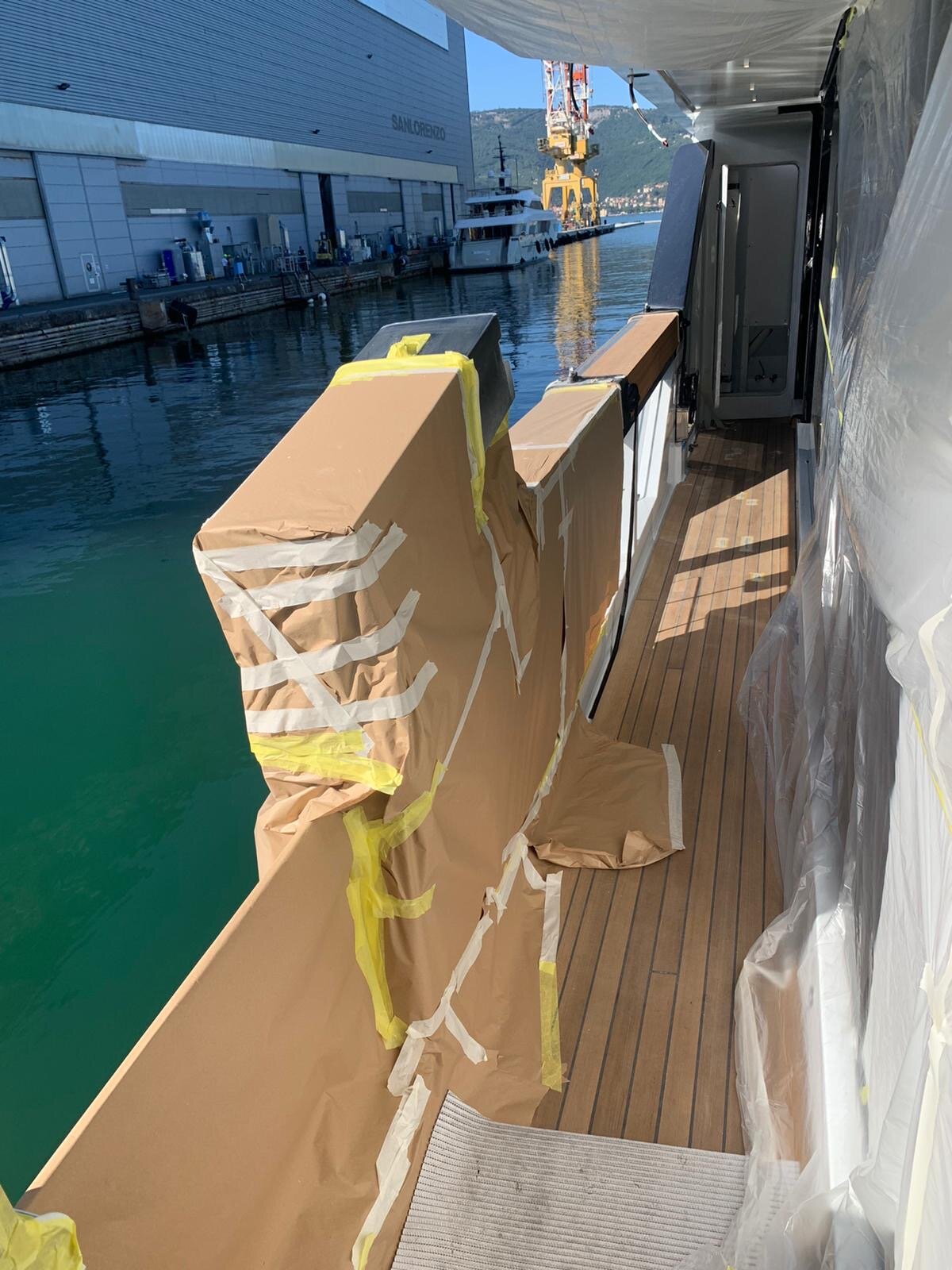 Sanding of the teak on the side hull doors is underway