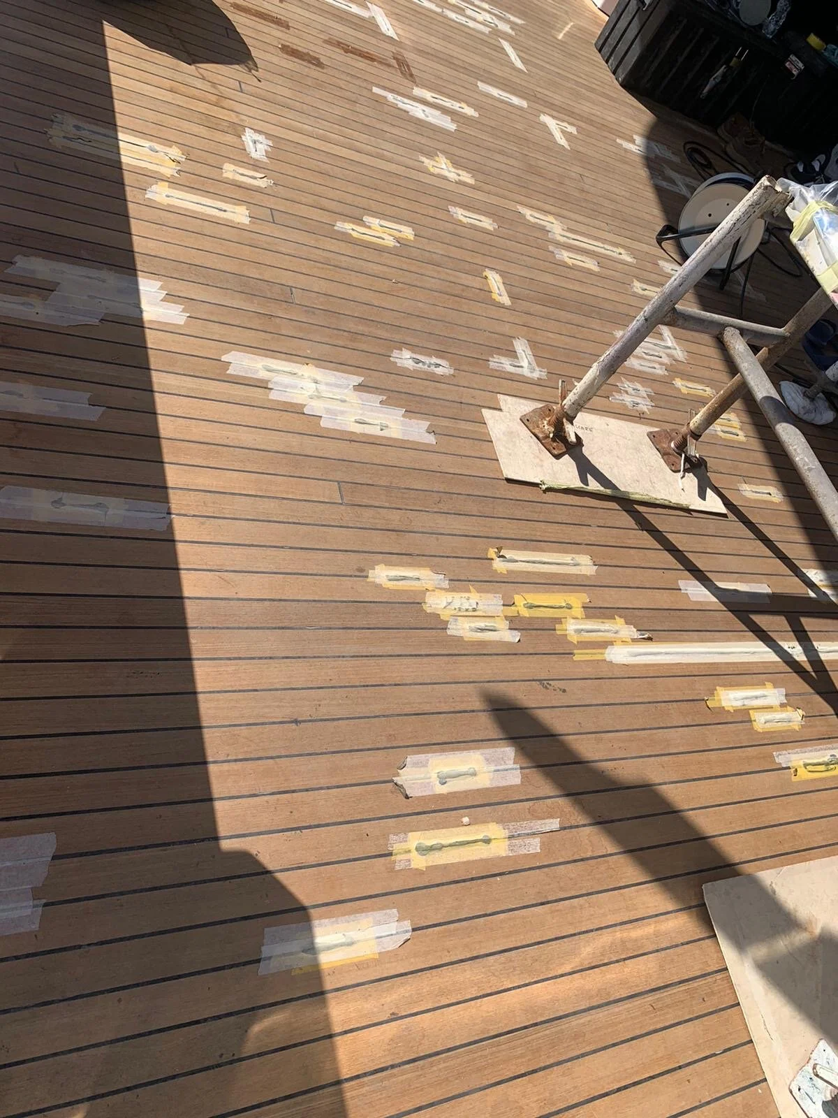 Caulking repairs being carried out after sanding of teak