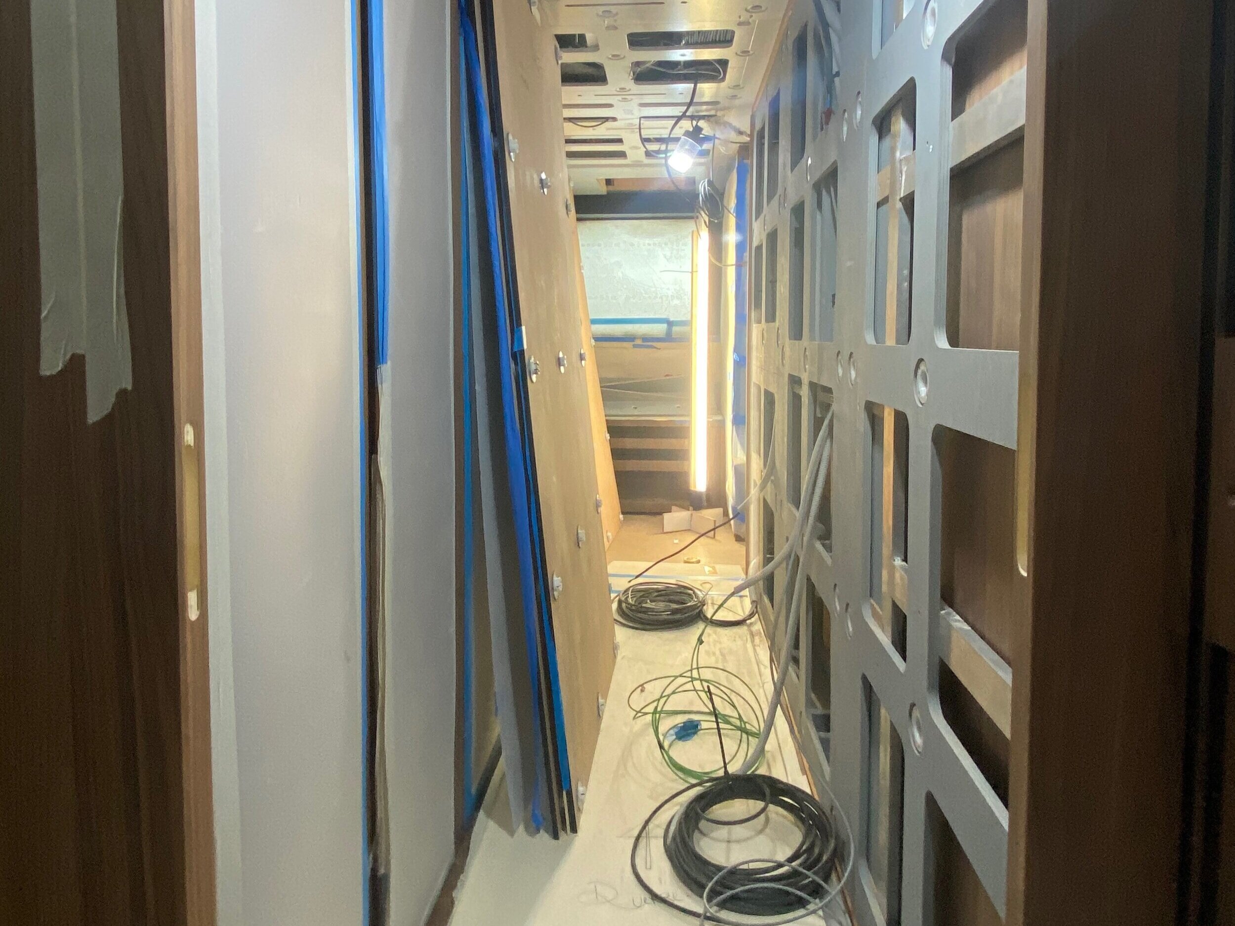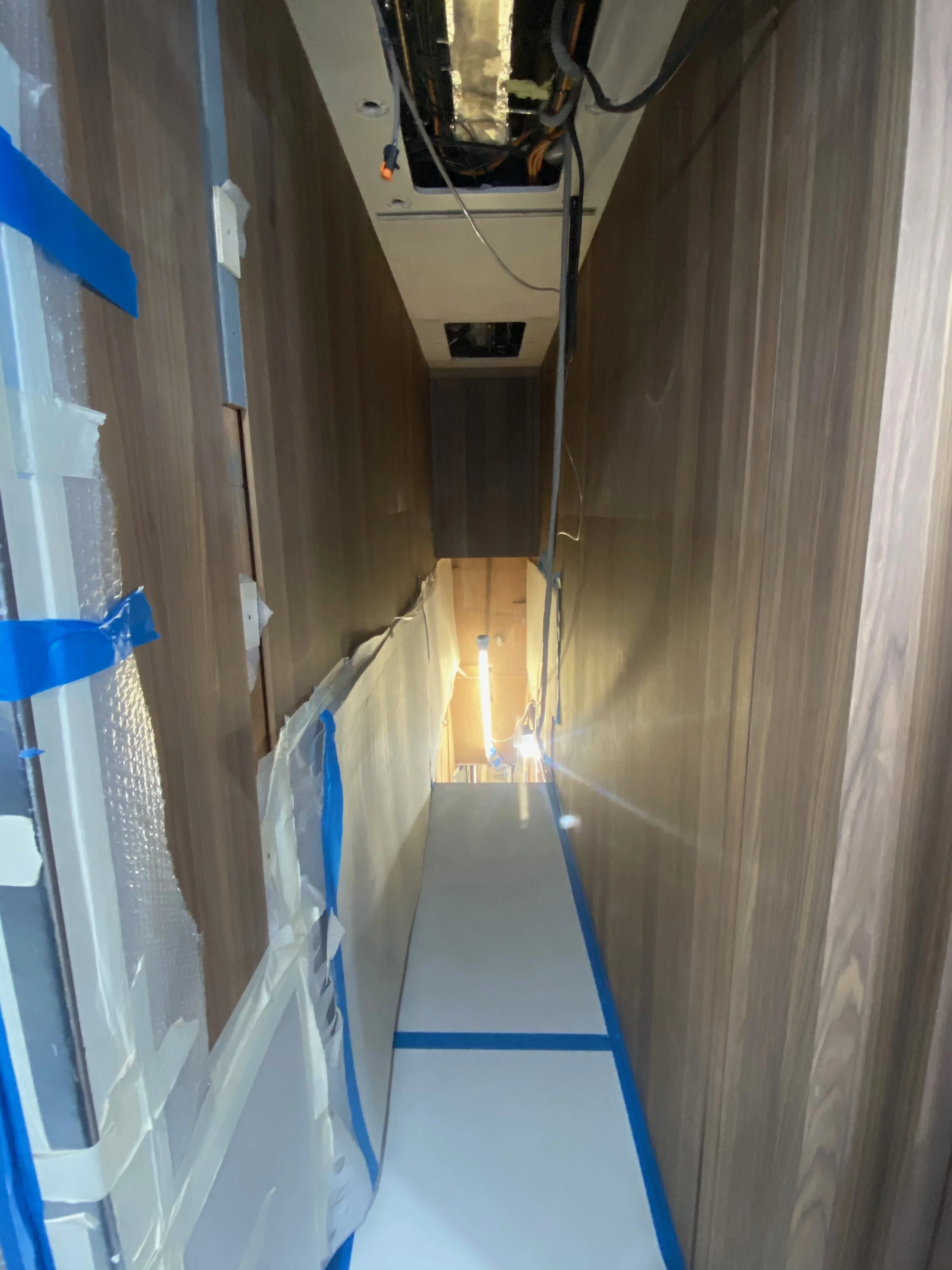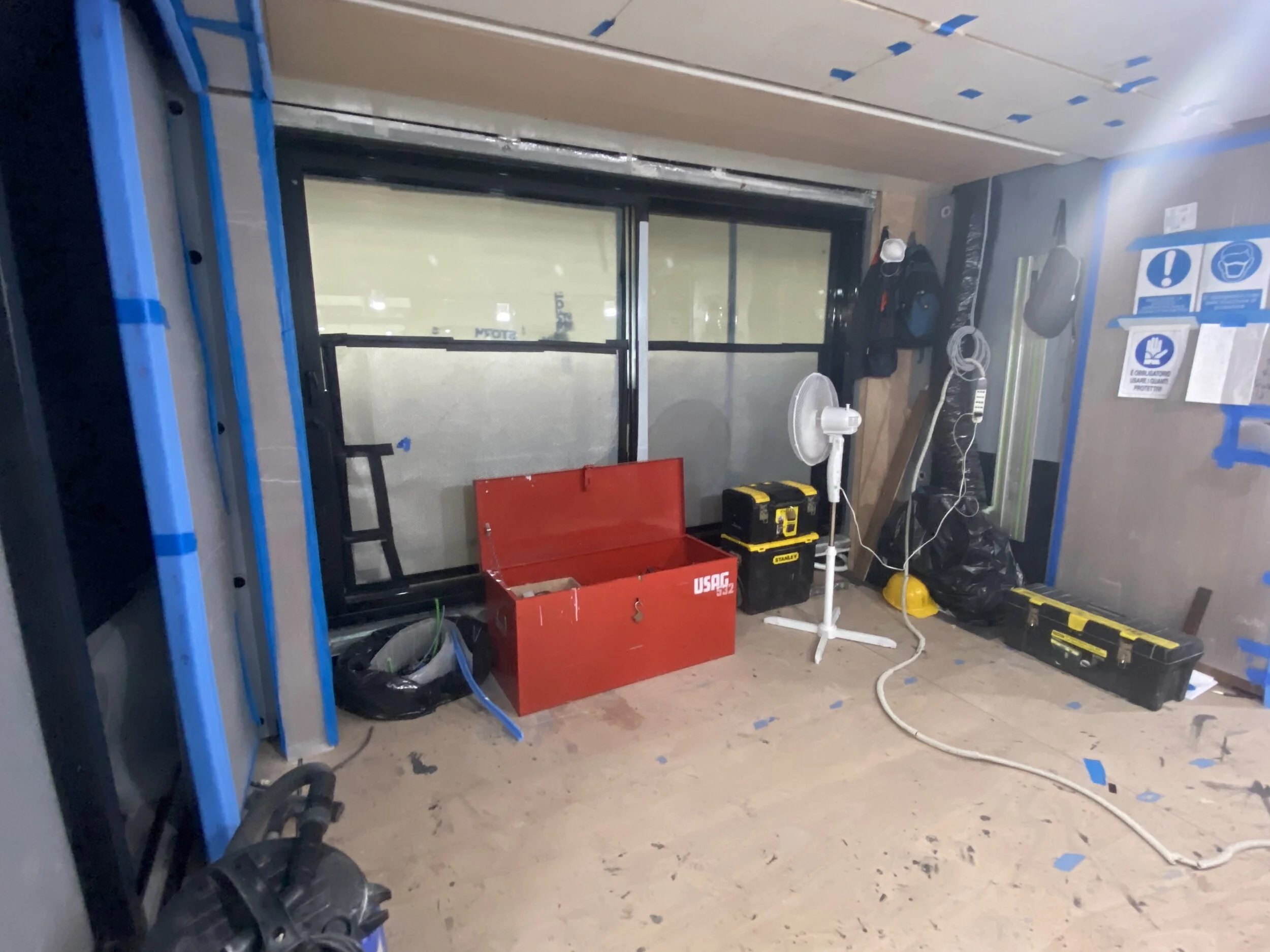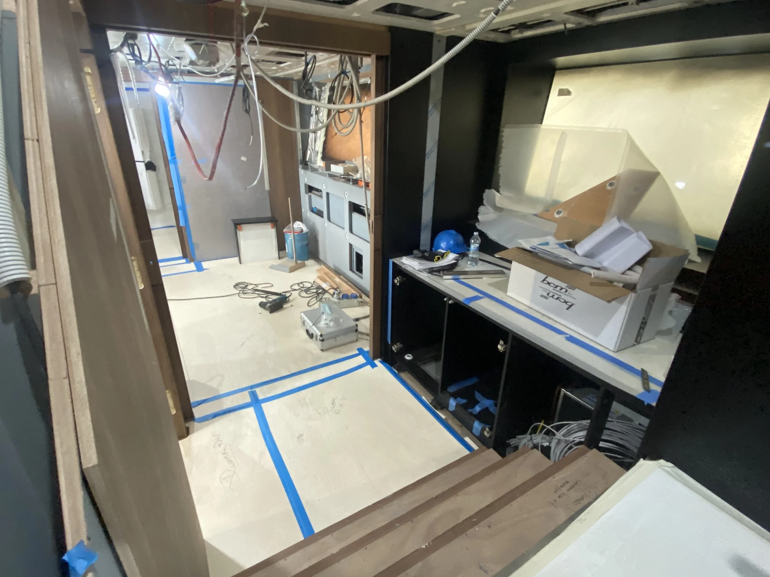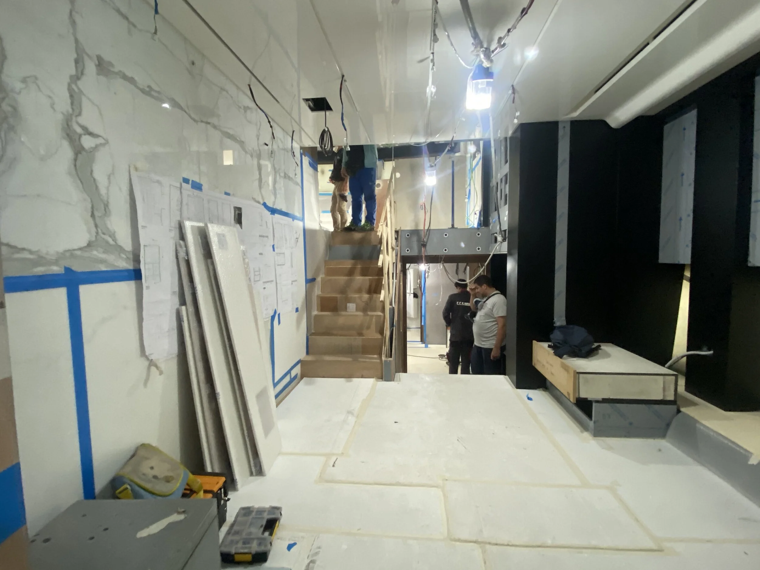 Owners lobby top coat paint in jet black and 2nd stage carpentry