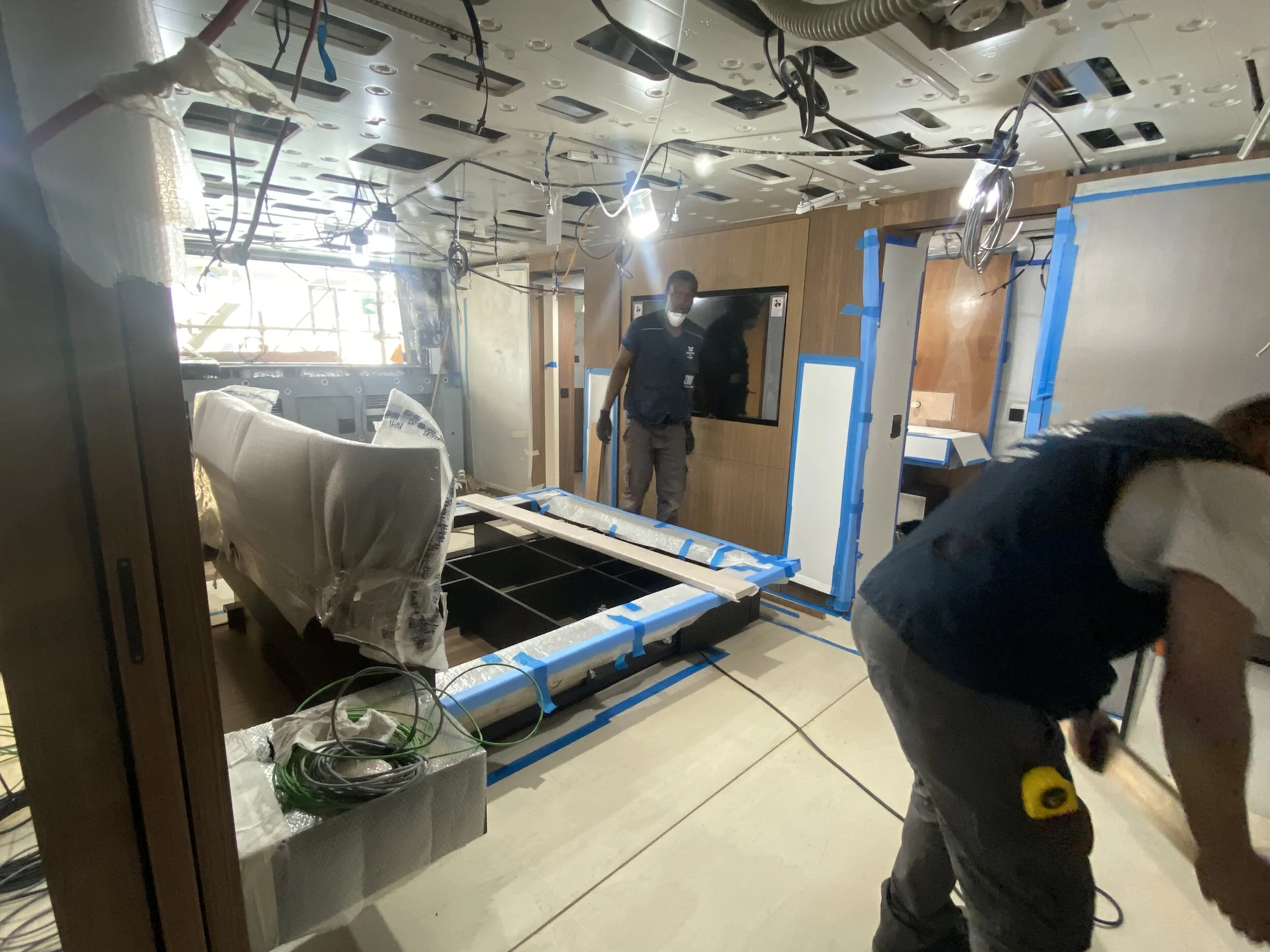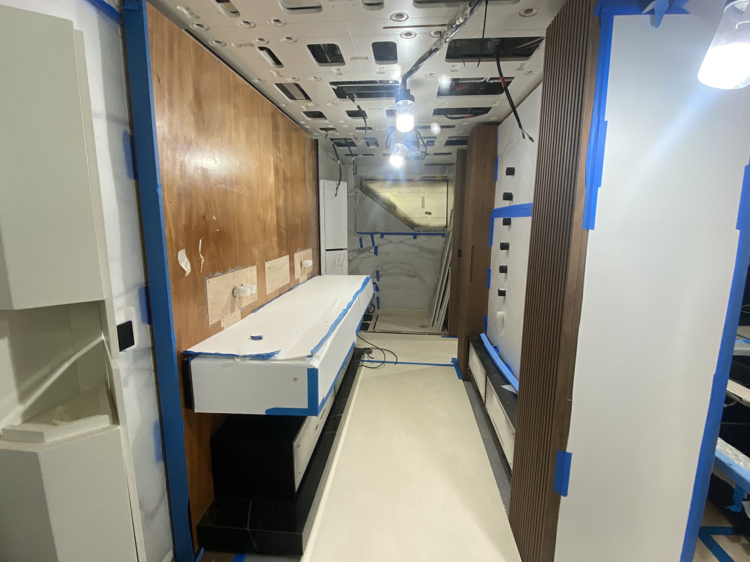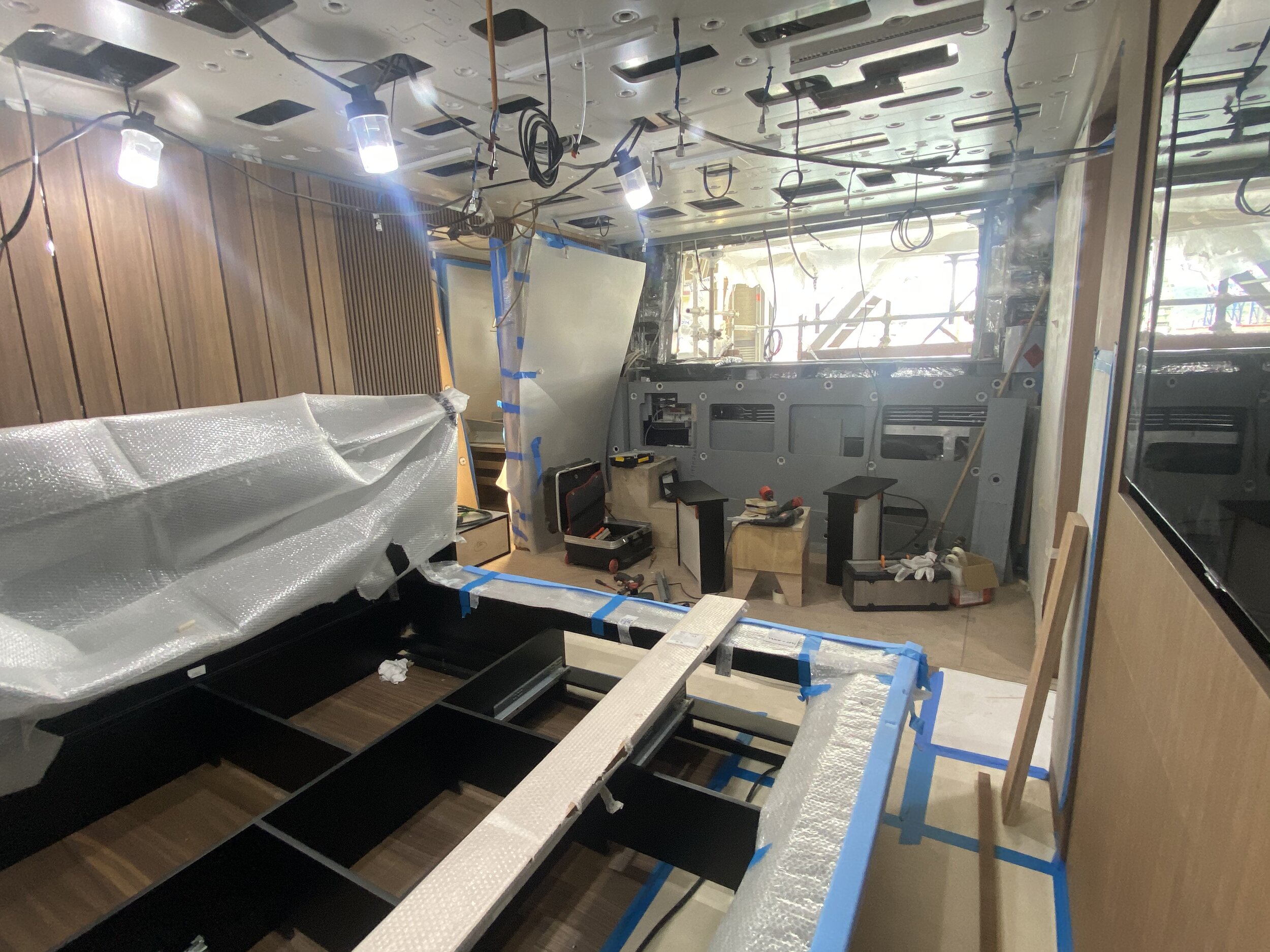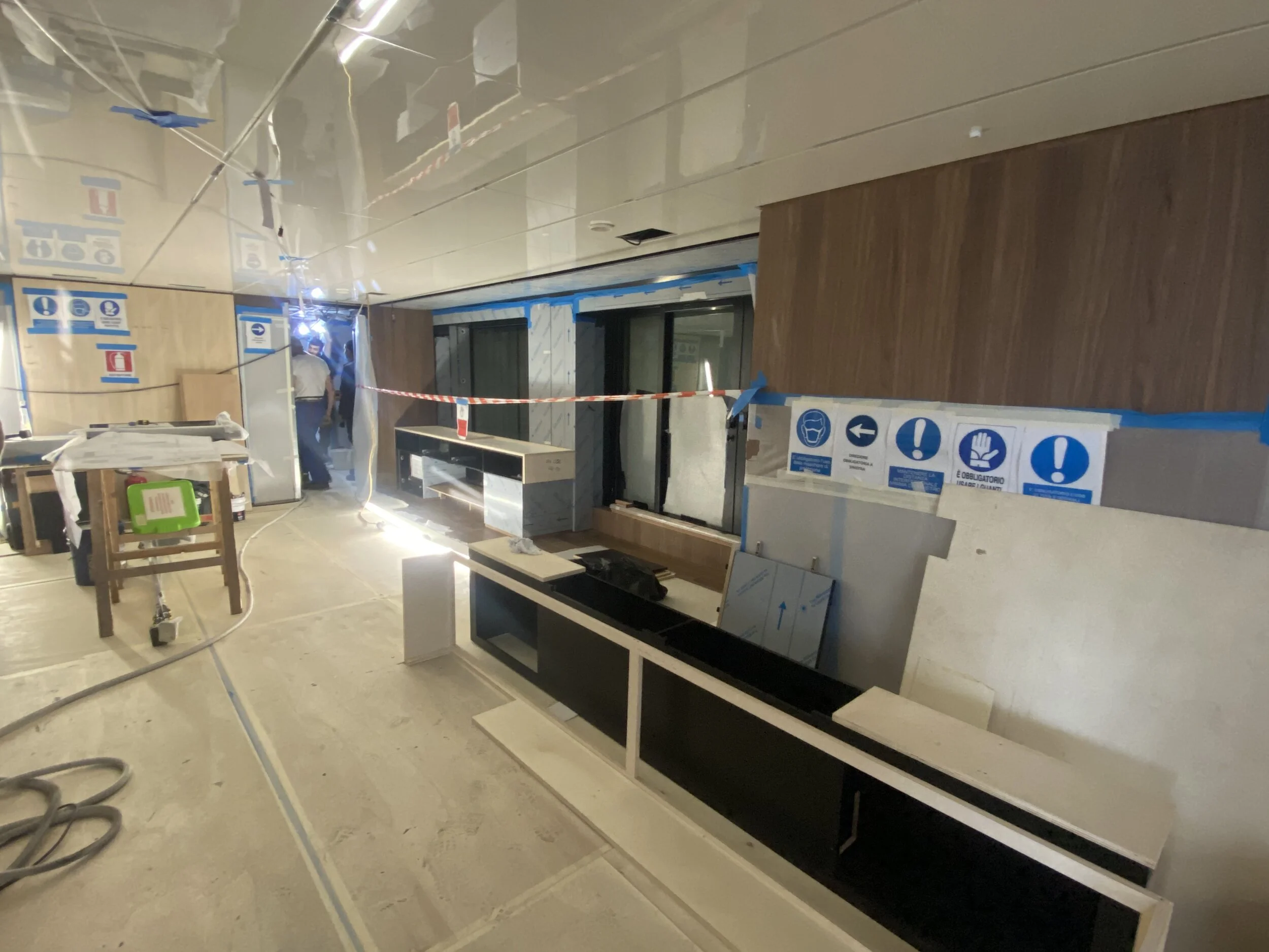 Owners lobby top coat paint in jet black and 2nd stage carpentry