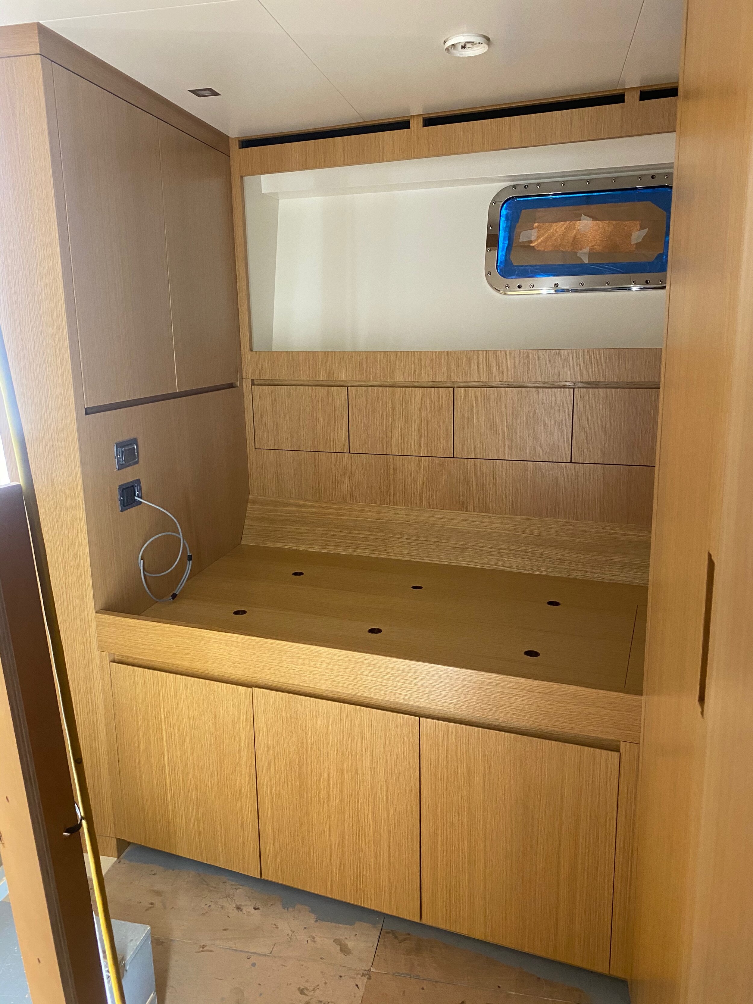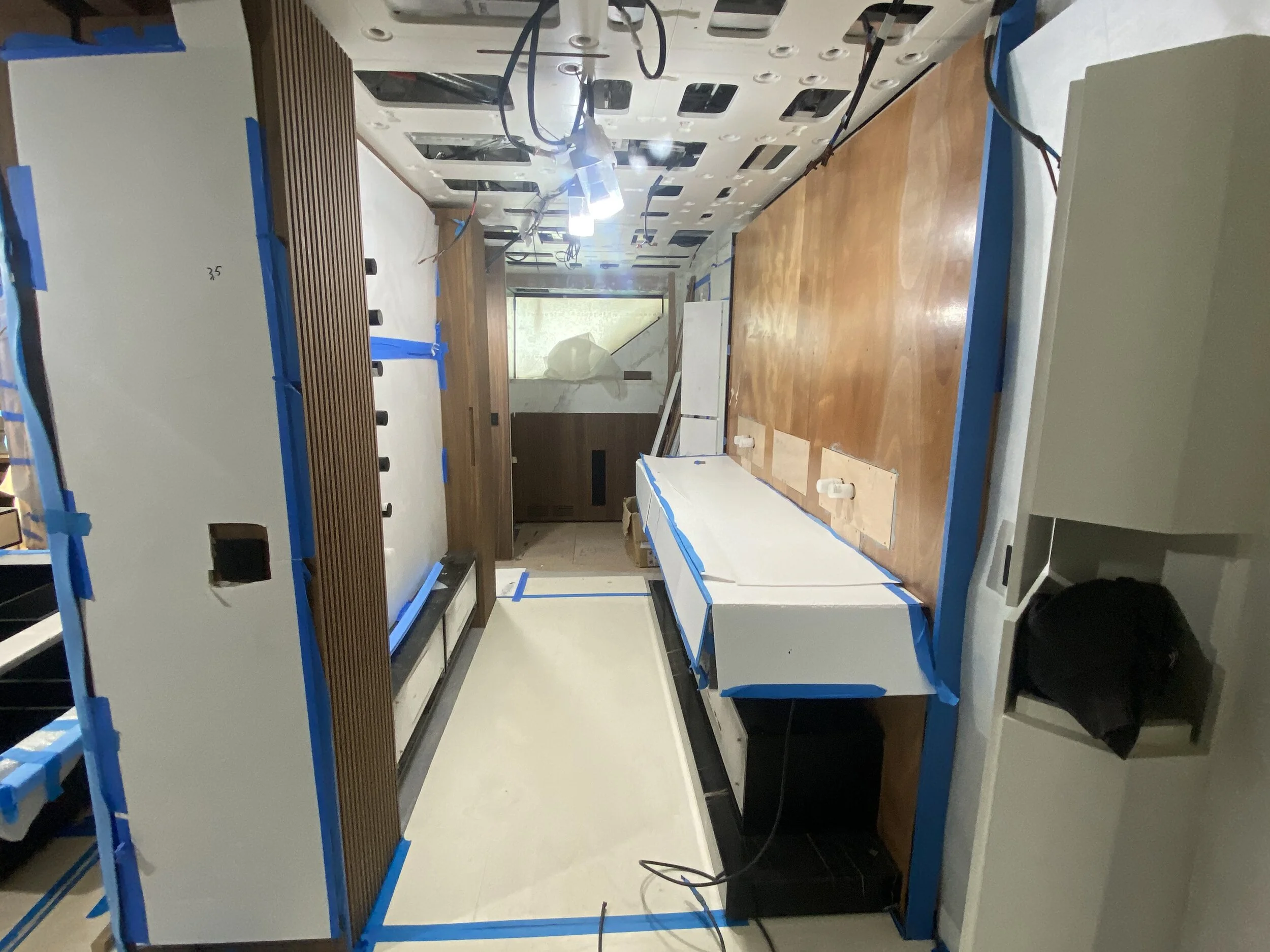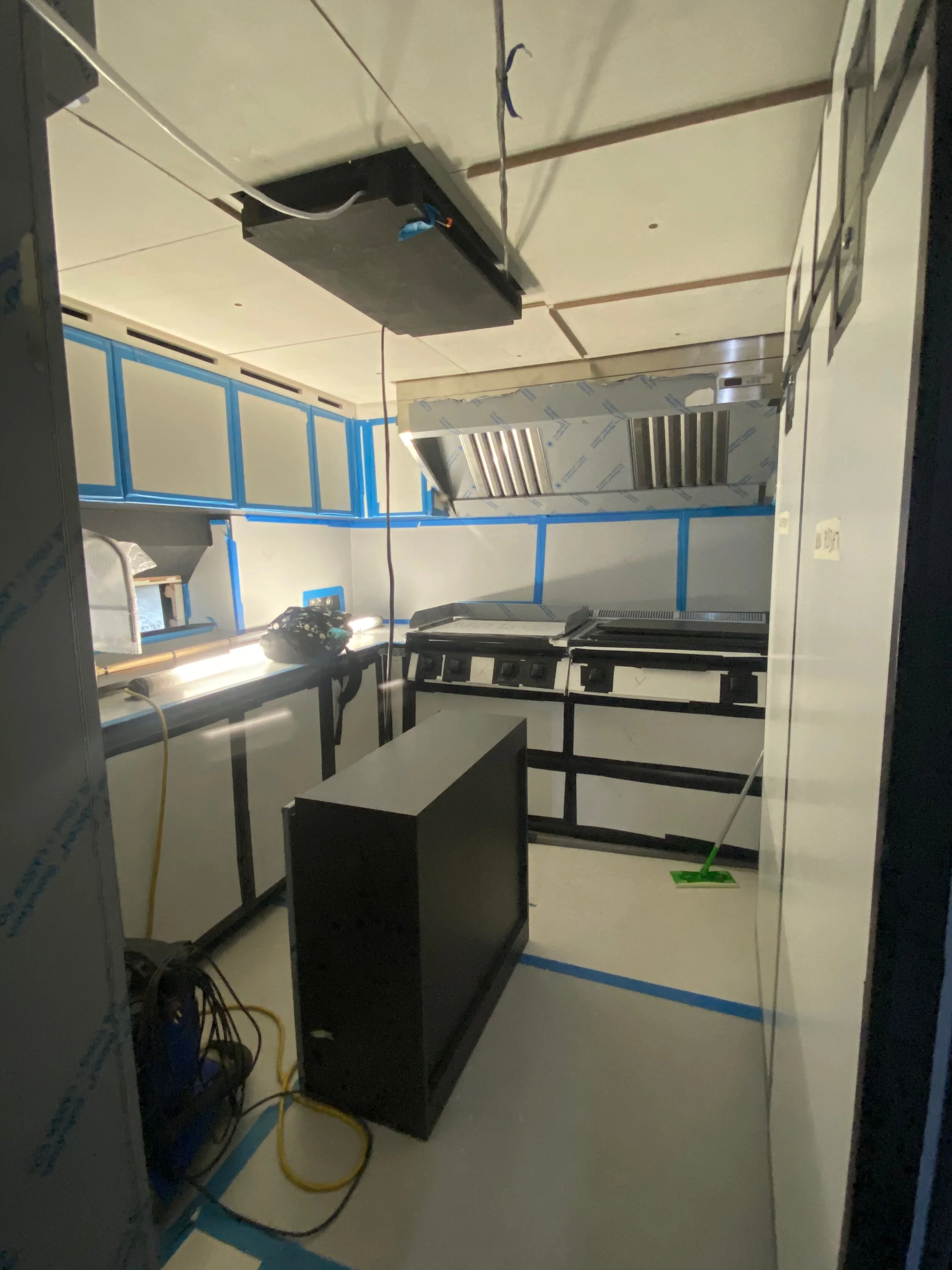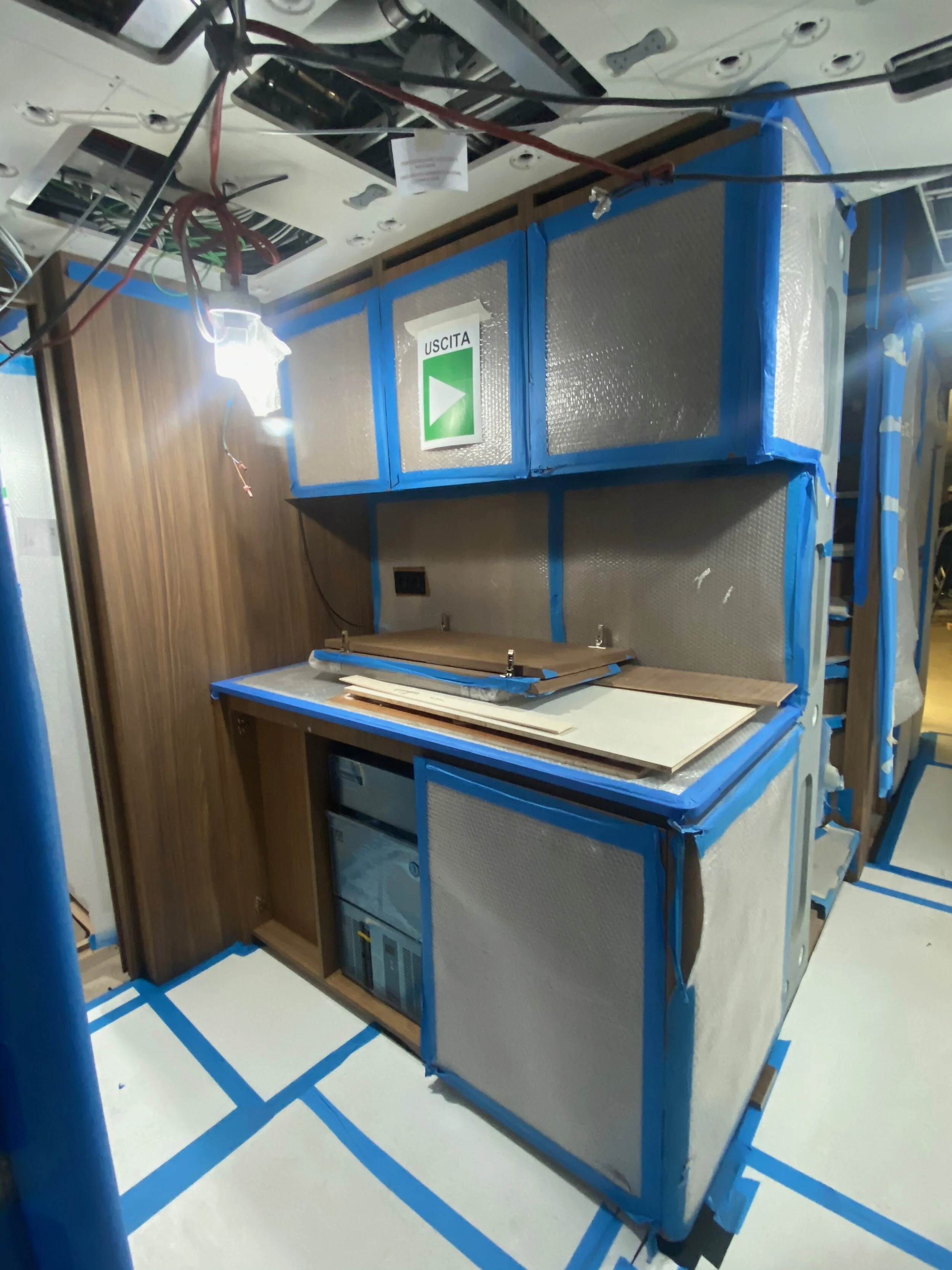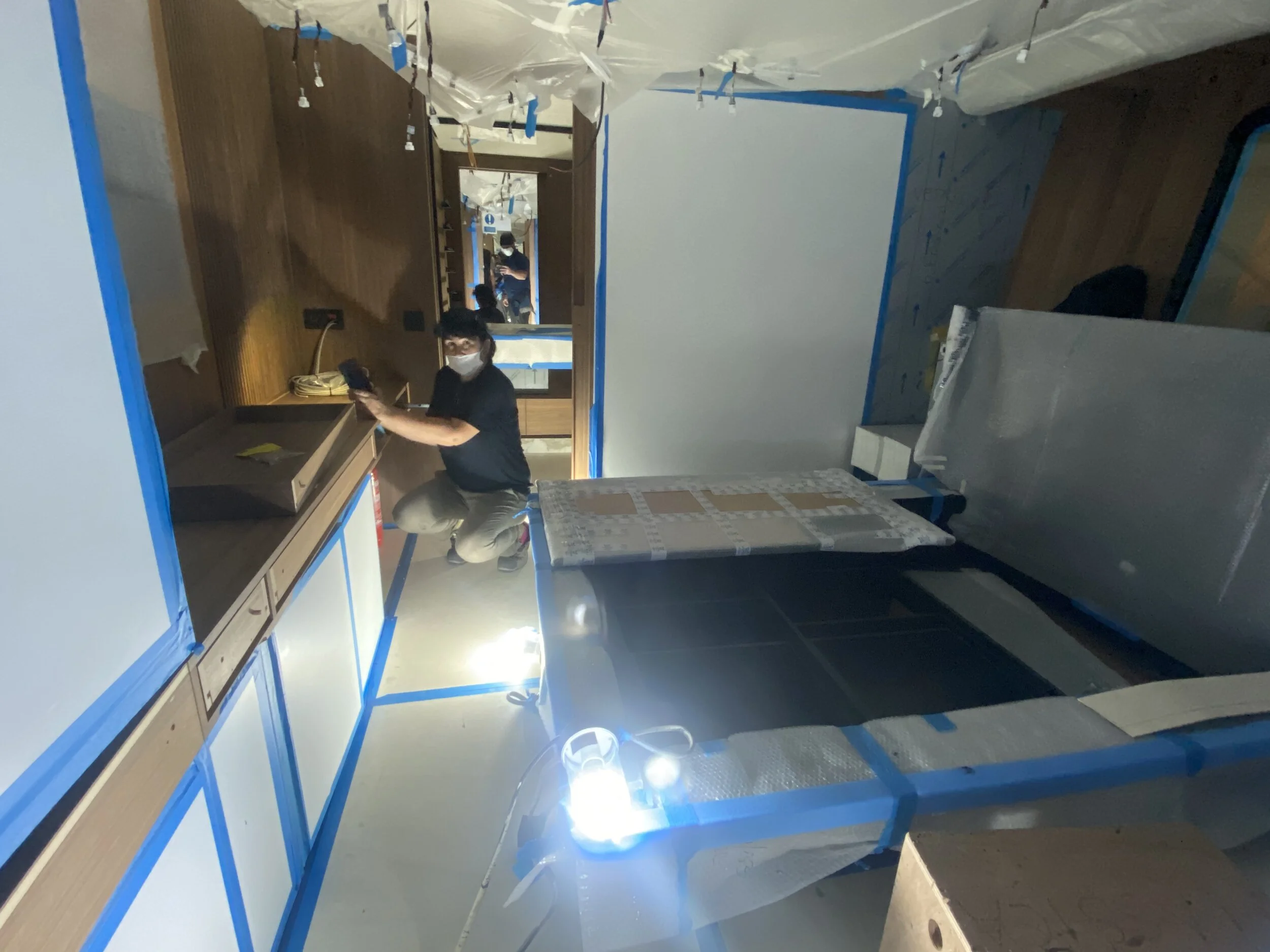 Owners lobby top coat paint in jet black and 2nd stage carpentry