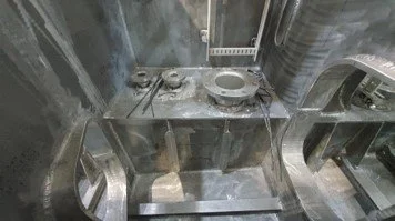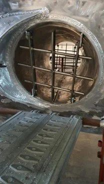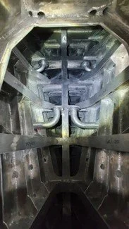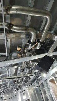 Inside the Engine Room, the lower section of the Main Engine exhaust is welded into the hull where it goes overboard below the waterline on the underside of the hull.