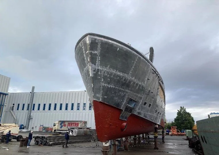 The vessel is now taking shape as the various block components have been welded together in preparation for the transfer to Marina Di Carrara which will take place on Monday 12th at 2200 hrs.