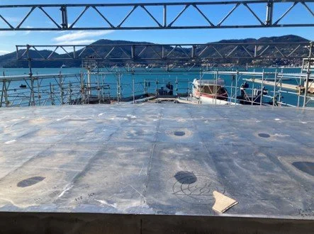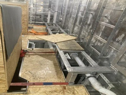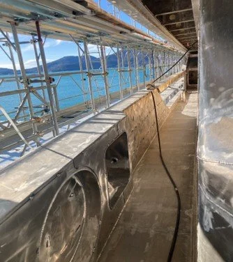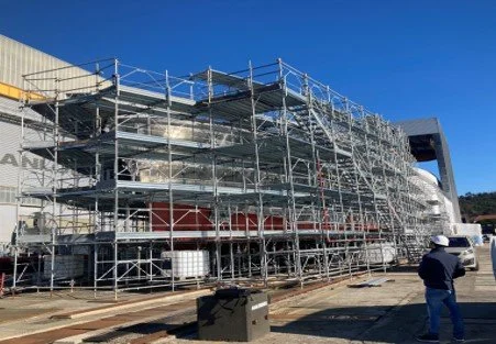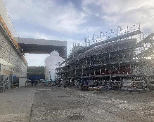 The scaffolding is almost complete in readiness for tenting. Whilst the tenting process prevails there will be much pre-outfitting works in progress which mainly includes cable tray installation throughout ,pipe work, insulation works, sound dampening  and hot-works relating to the engine room frame work.