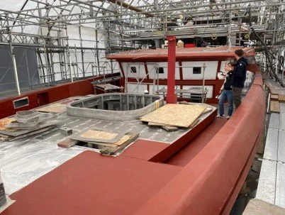 The metal works and cut-out for the sun deck skylight is in process. This looks like a great addition to the Vessel.